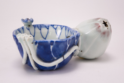 Watervaatje of waterdruppelaar voor schrijftafel in de vorm van een gebogen lotusblad in blauw, met daaraan een witte lotusknop met paars rode punt, Van Diepencollectie, JMD-P-2243 |