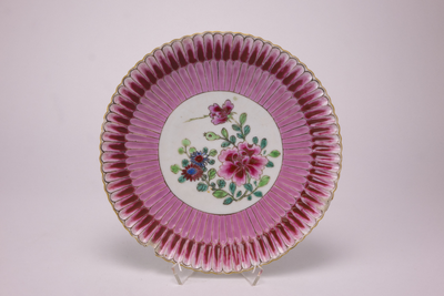 Famille rose bord met op plat een tak met een pioenroos. Vanuit het plat naar de rand twee rijen met vele in relief aangebrachte roze bloemblaadjes. Op de lip een goudkleurige lijn. (Nederlands)
