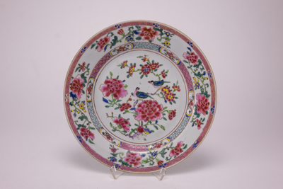 Plat famille rose bord met op het plat een pioen- en vogeldecor. Hier omheen een band in roze en lichtblauw, onderbroken door een vlak met een bloemtakje. Op de rand vier veelkeurige bloemtakken met pioenrozen. Op de rand een smalle roze band. Op de lip een bruine lijn. (Nederlands)