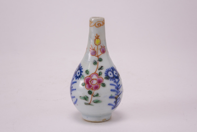 Famille rose knotsvormig miniatuurvaasje. Langs de rand een ijzerrood sierrandje. Op de buitenzijde drie bloemen in onderglazuur blauw, afgewisseld met drie faille rose bloemtakken. (Nederlands)