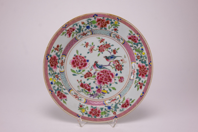 Plat famille rose bord met op het plat een pioen- en vogeldecor. Hier omheen een band in roze en lichtblauw, onderbroken door een vlak met een bloemtakje. Op de rand vier veelkeurige bloemtakken met pioenrozen. Op de rand een smalle roze band. Op de lip een bruine lijn. (Nederlands)