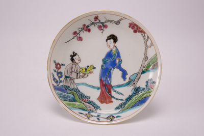 Schoteltje met op het plat een famille rose lijzendecoratie, Van Diepencollectie, JMD-P-2313