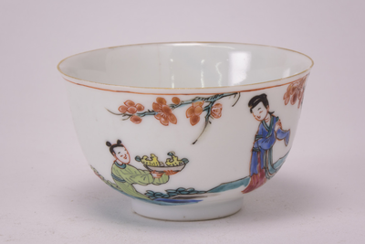 Kommetje met op de buitenzijde een famille rose lijzendecoratie. (Nederlands)