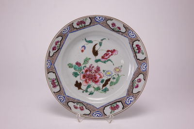 Wit rond Famille rose bord met acht hoekig bruin servetrand decor met acht uitsparingen waarin pioenrozen zijn aangebracht, Van Diepencollectie, JMD-P-2326 |