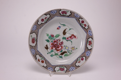 Wit rond Famille rose bord met acht hoekig bruin servetrand decor met acht uitsparingen waarin pioenrozen zijn aangebracht.. Op het plat een famille rose pioendecor.
