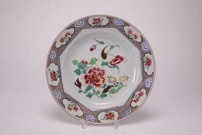 Wit rond Famille rose bord met acht hoekig bruin servetrand decor met acht uitsparingen waarin pioenrozen zijn aangebracht, Van Diepencollectie, JMD-P-2332 |