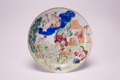 Schoteltje op een voetring. Gedecoreerd in emailkleuren en goud met een allegorische voorstelling van het element Vuur. In het midden van de voorstelling is Jupiter te zien, god van het licht en de (stralende) hemel en alle natuurverschijnselen. Rechts afgebeeld is Vulcanus, god van het vuur en het smidswerk. In de wolken in een wagen zit Venus, de godin van de liefde. Rondom verschillende Amors, zij symboliseren de kracht die staal en diamant kunnen doorboren, en zelfs de harten van de goden. De voorstelling is bijzonder amateuristisch geschilderd.De prent die als voorbeeld diende werd gemaakt door Antoine Herisset (1685-1769) naar een schilderij van Francesco Albani (1578-1669). De voorstelling is uit een serie van vier, de andere elementen zijn Water, Lucht en Aarde. Alle elementen zijn uitgebeeld door dezelfde kunstenaars, op schilderij en op prent. Al deze voorstellingen komen voor op porselein. (Nederlands)