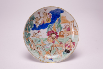 Schoteltje op een voetring. Gedecoreerd in emailkleuren en goud met een allegorische voorstelling van het element Vuur. In het midden van de voorstelling is Jupiter te zien, god van het licht en de (stralende) hemel en alle natuurverschijnselen. Rechts afgebeeld is Vulcanus, god van het vuur en het smidswerk. In de wolken in een wagen zit Venus, de godin van de liefde. Rondom verschillende Amors, zij symboliseren de kracht die staal en diamant kunnen doorboren, en zelfs de harten van de goden. De voorstelling is bijzonder amateuristisch geschilderd.De prent die als voorbeeld diende werd gemaakt door Antoine Herisset (1685-1769) naar een schilderij van Francesco Albani (1578-1669). De voorstelling is uit een serie van vier, de andere elementen zijn Water, Lucht en Aarde. Alle elementen zijn uitgebeeld door dezelfde kunstenaars, op schilderij en op prent. Al deze voorstellingen komen voor op porselein. (Nederlands)