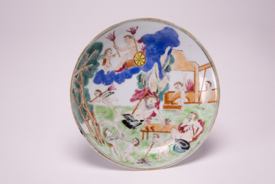 Schoteltje op een voetring. Gedecoreerd in emailkleuren en goud met een allegorische voorstelling van het element Vuur. In het midden van de voorstelling is Jupiter te zien, god van het licht en de (stralende) hemel en alle natuurverschijnselen. Rechts afgebeeld is Vulcanus, god van het vuur en het smidswerk. In de wolken in een wagen zit Venus, de godin van de liefde. Rondom verschillende Amors, zij symboliseren de kracht die staal en diamant kunnen doorboren, en zelfs de harten van de goden. De voorstelling is bijzonder amateuristisch geschilderd.De prent die als voorbeeld diende werd gemaakt door Antoine Herisset (1685-1769) naar een schilderij van Francesco Albani (1578-1669). De voorstelling is uit een serie van vier, de andere elementen zijn Water, Lucht en Aarde. Alle elementen zijn uitgebeeld door dezelfde kunstenaars, op schilderij en op prent. Al deze voorstellingen komen voor op porselein. (Nederlands)