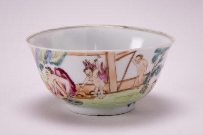 Kommetje met op de buitenzijde in emailkleuren en goud met een allegorische voorstelling van het element Vuur. In het midden van de voorstelling is Jupiter te zien, god van het licht en de (stralende) hemel en alle natuurverschijnselen. Rechts afgebeeld is Vulcanus, god van het vuur en het smidswerk. In de wolken in een wagen zit Venus, de godin van de liefde. Rondom verschillende Amors, zij symboliseren de kracht die staal en diamant kunnen doorboren, en zelfs de harten van de goden. De voorstelling is bijzonder amateuristisch geschilderd.De prent die als voorbeeld diende werd gemaakt door Antoine Herisset (1685-1769) naar een schilderij van Francesco Albani (1578-1669). De voorstelling is uit een serie van vier, de andere elementen zijn Water, Lucht en Aarde. Alle elementen zijn uitgebeeld door dezelfde kunstenaars, op schilderij en op prent. Al deze voorstellingen komen voor op porselein. (Nederlands)