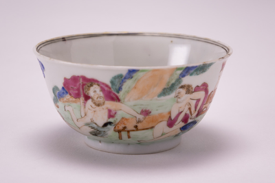 Kommetje met op de buitenzijde in emailkleuren en goud met een allegorische voorstelling van het element Vuur. In het midden van de voorstelling is Jupiter te zien, god van het licht en de (stralende) hemel en alle natuurverschijnselen. Rechts afgebeeld is Vulcanus, god van het vuur en het smidswerk. In de wolken in een wagen zit Venus, de godin van de liefde. Rondom verschillende Amors, zij symboliseren de kracht die staal en diamant kunnen doorboren, en zelfs de harten van de goden. De voorstelling is bijzonder amateuristisch geschilderd.De prent die als voorbeeld diende werd gemaakt door Antoine Herisset (1685-1769) naar een schilderij van Francesco Albani (1578-1669). De voorstelling is uit een serie van vier, de andere elementen zijn Water, Lucht en Aarde. Alle elementen zijn uitgebeeld door dezelfde kunstenaars, op schilderij en op prent. Al deze voorstellingen komen voor op porselein. (Nederlands)