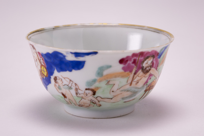 Kommetje met op de buitenzijde in emailkleuren en goud met een allegorische voorstelling van het element Vuur. In het midden van de voorstelling is Jupiter te zien, god van het licht en de (stralende) hemel en alle natuurverschijnselen. Rechts afgebeeld is Vulcanus, god van het vuur en het smidswerk. In de wolken in een wagen zit Venus, de godin van de liefde. Rondom verschillende Amors, zij symboliseren de kracht die staal en diamant kunnen doorboren, en zelfs de harten van de goden. De voorstelling is bijzonder amateuristisch geschilderd.De prent die als voorbeeld diende werd gemaakt door Antoine Herisset (1685-1769) naar een schilderij van Francesco Albani (1578-1669). De voorstelling is uit een serie van vier, de andere elementen zijn Water, Lucht en Aarde. Alle elementen zijn uitgebeeld door dezelfde kunstenaars, op schilderij en op prent. Al deze voorstellingen komen voor op porselein. (Nederlands)