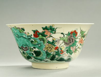 Bowl on footring, spreading rim. The outside is covered with a light-brown glaze. Famille verte, decorated in various shades of green, yellow, aubergine, iron-red and black enamels on the glaze with a large garden rock and flowering plants. The inside is undecorated. The base is marked with an incense-burner in a double circle. (Engels)