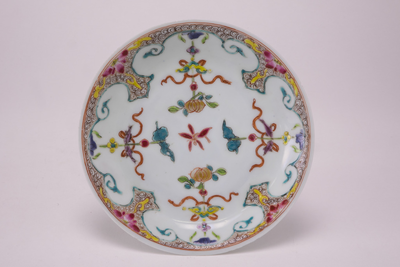 Wit schoteltje met op de rand en op het plat een meerkleurig cartouche decor, Van Diepencollectie, JMD-P-2367 |