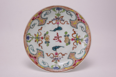 Wit schoteltje met op de rand en op het plat een meerkleurig cartouche decor, Van Diepencollectie, JMD-P-2368 |