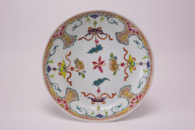 Wit schoteltje met op de rand en op het plat een meerkleurig cartouche decor, Van Diepencollectie, JMD-P-2369 |