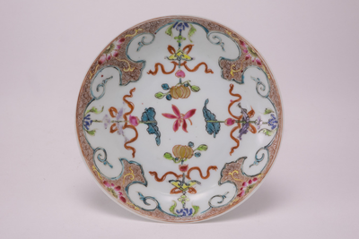 Wit schoteltje met op de rand en op het plat een meerkleurig cartouche decor.