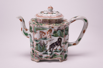 Square teapot with four flat feet at the corners, the upright sides slightly accolade-shaped and indented at the corners, flat shoulder, rectangular low mouthrim. Lobed, low-domed lid with pointed knob. S-shaped spout and C-shaped handle. Famille verte, decorated in various shades of green, yellow, aubergine, iron-red and black enamel on the glaze. On each of the four sides a landscape with two horses. On the shoulder flower and foliate scrolls and small panels with auspicious symbols. On the mouthrim and rim of the lid a spiral band. The base is unglazed. (Engels)