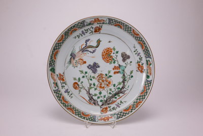 Groot wit rond bord met op het plat een famille verte decor met pioenen, takken en een vliegende Phoenix, Van Diepencollectie, JMD-P-2387 |