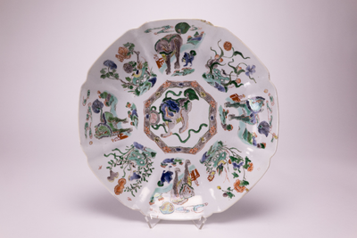 Dish on footring. The spreading sides divided into eight panels in low relief, octagonally-lobed rim. Famille verte, decorated in various shades of green, yellow, blue, iron-red, aubergine and black enamel on the glaze. In the centre a Fo-dog with a ball and ribbons within a star-shaped panel formed by a band of single blossoms and spirals. On the eight side panels four depictions of a landscape with a lion (twice with cubs) alternating with a bird on a rock with flowering plants, among which peonies, chrysanthemums and coxcomb. On the reverse of the sides, panels with a flower spray alternating with undecorated panels. On the base a fungus (lingzhi) mark in a double circle. (Engels)