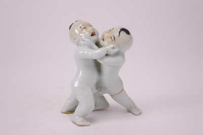 Twee worstelende jongetjes in wit porcelein met enige gekleurde plekken in ijzerrood en zwart. (Nederlands)