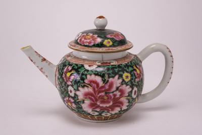 Teapot on footring, wide mouthrim. Straight spout, C-shaped handle. Domed lid with flat, protruding rim and pointed knob. Famille rose, decorated in green, black, yellow, white and pink with a large peony on either side surrounded by chrysanthemums and other small flowers on a ground of green scrolls reserved in black enamel. The same decoration on the lid. Around the foot a band with lotus motifs, on the shoulder and around the cover-ring a band with striped triangles and medallions with a half-peony. On the spout and ear flower sprays. (Engels)