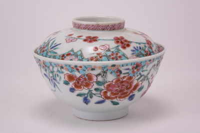 Kommetje op standring met deksel, beide beschilderd met florale motieven in groen, roze en blauw email en op de bodem van het kommetje een bloemetje.