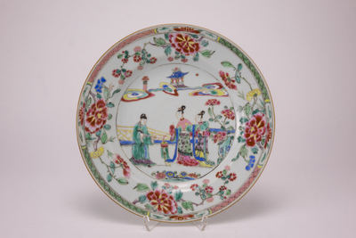 Schotel op voetring, platte rand. Famille rose, versierd in verschillende kleuren groen, blauw, geel, zwart en roze met twee vrouwen op een terras, een dienaar met een lampion, bloeiende planten en een rots. Op de achtergrond een wolkenbank en het dak van een paviljoen. Op de wand en rand vier pioentakken. Rond de rand een smalle band met diamantwerk in roze en groen, onderbroken door vier medaillons met een halve pioen. Op de achterzijde vier bloemtakken in rood. (Nederlands)