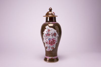 Capucijner smalle hoge vaas met knopdeksel. In het bruin uitsparingen met hierin famille rose bloemdecoraties.