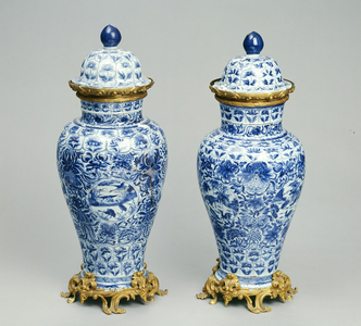 Two tall, baluster-shaped lidded jars on footring, wide neck, high-domed lid with spreading rim and pointed knob. Decorated in underglaze blue with an exuberant representation of large flower sprays, mainly peonies, separated by four medallions containing a landscape with birds, deer or a rooster with hens. Around the foot, on the shoulder and lid two rows of lotus-petal shaped panels with a flower spray. On the neck a band of flower sprays and a band of lotus panels with flower sprays. The base marked with a fungus (lingzhi) in a double circle. Complete with an 18th-century (French?) bronze-gilt mounting. (Engels)