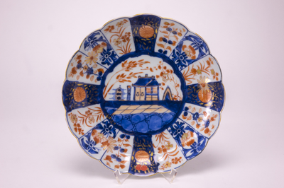 Geplooide schaal met op het plat een huis met een tuin. De gelobde rand heeft een indeling van zestien vakken met hierin meerkleurige bloemdecoraties. (Nederlands)