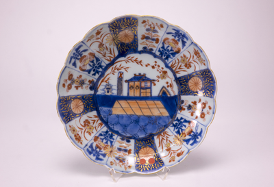 Geplooide schaal met op het plat een huis met een tuin. De gelobde rand heeft een indeling van zestien vakken met hierin meerkleurige bloemdecoraties. (Nederlands)