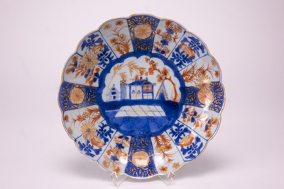 Geplooide schaal met op het plat een huis met een tuin. De gelobde rand heeft een indeling van zestien vakken met hierin meerkleurige bloemdecoraties. (Nederlands)