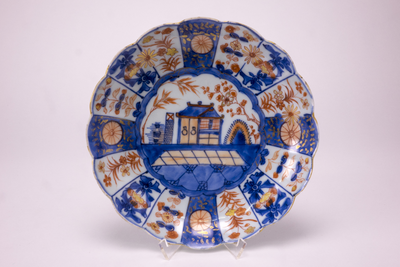 Geplooide schaal met op het plat een huis met een tuin. De gelobde rand heeft een indeling van zestien vakken met hierin meerkleurige bloemdecoraties. (Nederlands)