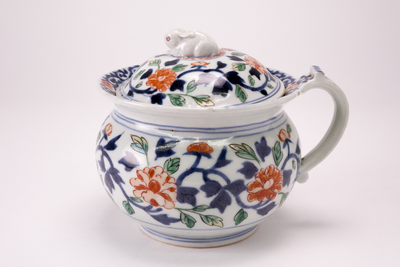 Small globular chamber pot on footring with spreading upturned rim. C-shaped ear with thumb-rest, domed recessed lid with a knob shaped as a reclining hare. Imari, decorated in underglaze blue, iron-red, green and yellow enamels with peony sprays. On the inside of the rim a karakusa scroll with single flowers. The hare has red eyes. (Engels)