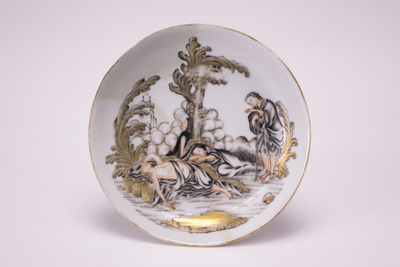 Schotel op voetring, spreidende wand. Versierd in encre de chine, ijzerrood en goud met een landschap met ronde rotsblokken en centraal een (palm?)boom. Daarvoor ligt een deels naakte figuur te slapen, daarnaast een man grotendeels onder een deken. Rechts staat een man op een staf geleund toe te kijken, een andere man staat geleund achter tegen de boom. Op de achtergrond een kristalvormig rotsblok. Rond de rand een band met fijne bloem- en bladranken in goud. (Nederlands)