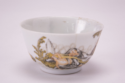 Schotel op voetring, spreidende wand. Versierd in encre de chine, ijzerrood en goud met een landschap met ronde rotsblokken en centraal een (palm?)boom. Daarvoor ligt een deels naakte figuur te slapen, daarnaast een man grotendeels onder een deken. Rechts staat een man op een staf geleund toe te kijken, een andere man staat geleund achter tegen de boom. Op de achtergrond een kristalvormig rotsblok. Rond de rand een band met fijne bloem- en bladranken in goud. (Nederlands)