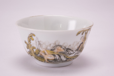 Schotel op voetring, spreidende wand. Versierd in encre de chine, ijzerrood en goud met een landschap met ronde rotsblokken en centraal een (palm?)boom. Daarvoor ligt een deels naakte figuur te slapen, daarnaast een man grotendeels onder een deken. Rechts staat een man op een staf geleund toe te kijken, een andere man staat geleund achter tegen de boom. Op de achtergrond een kristalvormig rotsblok. Rond de rand een band met fijne bloem- en bladranken in goud. (Nederlands)