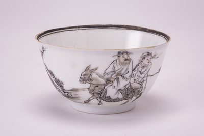 Wit kopje met langs de rand een zwarte en gouden lijn. Op de buitenzijde een landschapdecor met drie personen, een Mandarijn op een ezel, met een vrouw en een jongetje. Getekend in zwart met roze gekleurde gezichten en handen. (Nederlands)