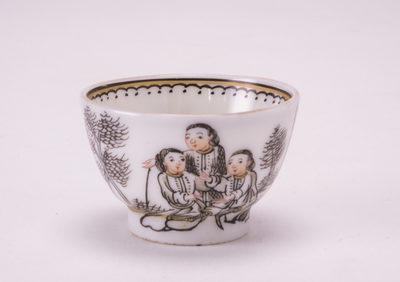 Miniatuur kommetje op voetring, rechte randen. Gedecoreerd in encre de Chine, ijzerrood en goud. Op de buitenzijde van het kommetje een decoratie van twee kinderen en een man, leunend op zijn wandelstok, bij een huis in een tuinlandschap. Voor hen staat een vrouw met haar handen uitgestrekt. (Nederlands)