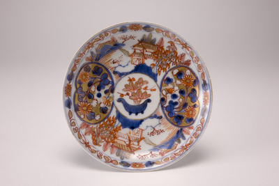 Miniatuur kommetje op voetring, rechte randen. Gedecoreerd in encre de Chine, ijzerrood en goud. Op de buitenzijde van het kommetje een decoratie van twee kinderen en een man, leunend op zijn wandelstok, bij een huis in een tuinlandschap. Voor hen staat een vrouw met haar handen uitgestrekt. (Nederlands)