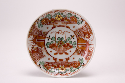 Amsterdams bont schoteltje. Op het plat witte uitsparingen met hierin een hengselmand of een landschapje.