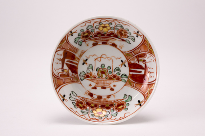 Amsterdams bont schoteltje. Op het plat witte uitsparingen met hierin een hengselmand of een landschapje.