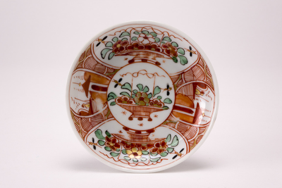 Amsterdams bont schoteltje. Op het plat witte uitsparingen met hierin een hengselmand of een landschapje.