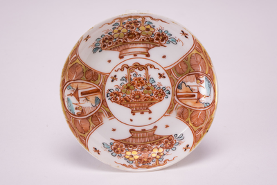 Amsterdams bont miniatuur schoteltje. Op het plat witte uitsparingen met hierin een hengselmand of een landschapje. (Nederlands)