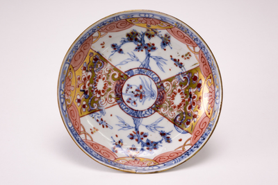 Amsterdams bont schotel met op het plat twee witte vlakken met een blauwe boom en twee goudkleurige vlakken met bloemen, Van Diepencollectie, JMD-P-2502 |