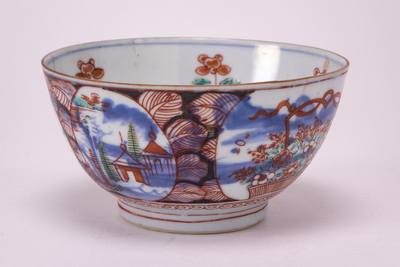 Amsterdams bont kom. Op de buitenzijde witte uitsparingen met hierin een hengselmand of een landschapje over blauwe onderglazuur decors. (Nederlands)