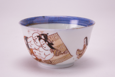 Two teacups and saucers on footring, spreading sides. Imari, decorated in underglaze blue, iron-red, black and gold with a naked couple partly covered by a blanket on a mattress. A kneeling maidservant at the head of the bed, a fan, a candlestick and a container with pots and a brush. On the rim a scrolling pattern in gold on a blue ground. Inside on the base of the cup a mating rooster and hen. On the reverse of the saucer a prunus, chrysanthemum and camellia. (Engels)