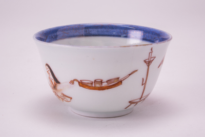 Kopje op voetring, spreidende wand. Imari, versierd in onderglazuur blauw, ijzerrood, zwart en goud met een naakt paar op een matras, half onder een deken. Aan het hoofdeinde een knielende dienares, een waaier, een kaarsenhouder en een bak met potjes en een penseel. Op de rand een rankpatroon in goud op een blauwe grond. Binnenin op de bodem van het kopje een parende haan en hen. Op de achterkant van de schotel een prunus, een chrysant en een camelia. (Nederlands)