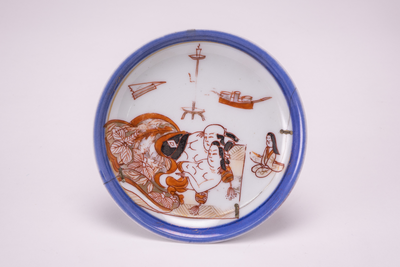 Schotel op voetring, spreidende wand. Imari, versierd in onderglazuur blauw, ijzerrood, zwart en goud met een naakt paar op een matras, half onder een deken. Aan het hoofdeinde een knielende dienares, een waaier, een kaarsenhouder en een bak met potjes en een penseel. Op de rand een rankpatroon in goud op een blauwe grond. Binnenin op de bodem van het kopje een parende haan en hen. Op de achterkant van de schotel een prunus, een chrysant en een camelia. (Nederlands)